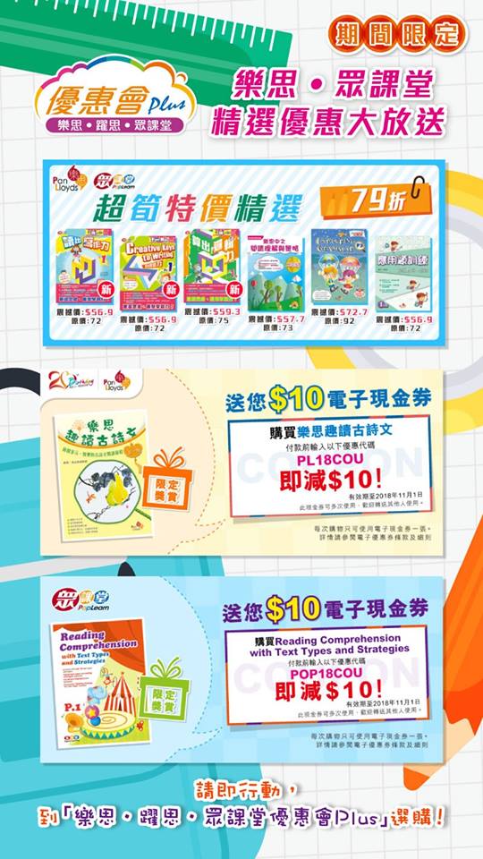 優惠/ Coupon code, 書店優惠 10 8 月, 2025 【圖書優惠】樂思.眾課堂精選優惠大放送 圖書低至79折優惠 樂思.眾課堂精選優惠大放送,圖書低至79折 優惠會Plus限時精選優惠 除震撼價優惠外,還有現金優惠券 貨量有限,售完即止,請到以下網址搶購 http://bit.ly/2018_promotions 2,238 閱讀更多 奇趣天地文具部及卡通文具全線88折優惠(至9月16日) Tags: 圖書優惠, 樂思, 眾課堂 Share: 文章導覽 Previous Previous post 【急救試題】2025聖約翰救傷隊急救包紮模擬情境試題溫習Next Next post 香港JLPT N2衝刺攻略 – 必知5個聽力與閱讀技巧 Related Posts 書店優惠 10 8 月, 2025 【2020 圖書優惠】商務印書局 圖書文具優惠大檢閱 閱讀是良好的習慣,你有沒有想過閱讀也可以更慳?我們 Teacholic 為你搜羅商務印書局2019的優惠,讓大家能夠買書買得更着數! 閱讀全文 優惠/ Coupon code 10 8 月, 2025 【書店95折】商務沙田圖書廣場新城市廣場三期店 開業優惠至7月31日 商務沙田圖書廣場已於7月1日歸來新城市廣場三期店與讀者重聚。 閱讀全文